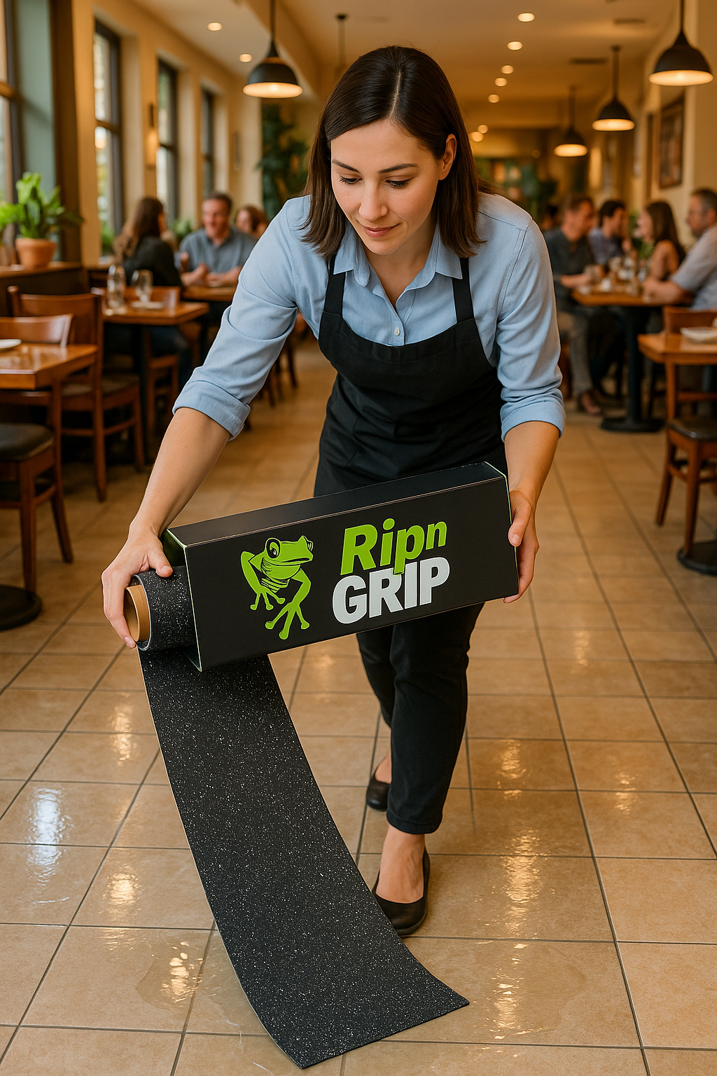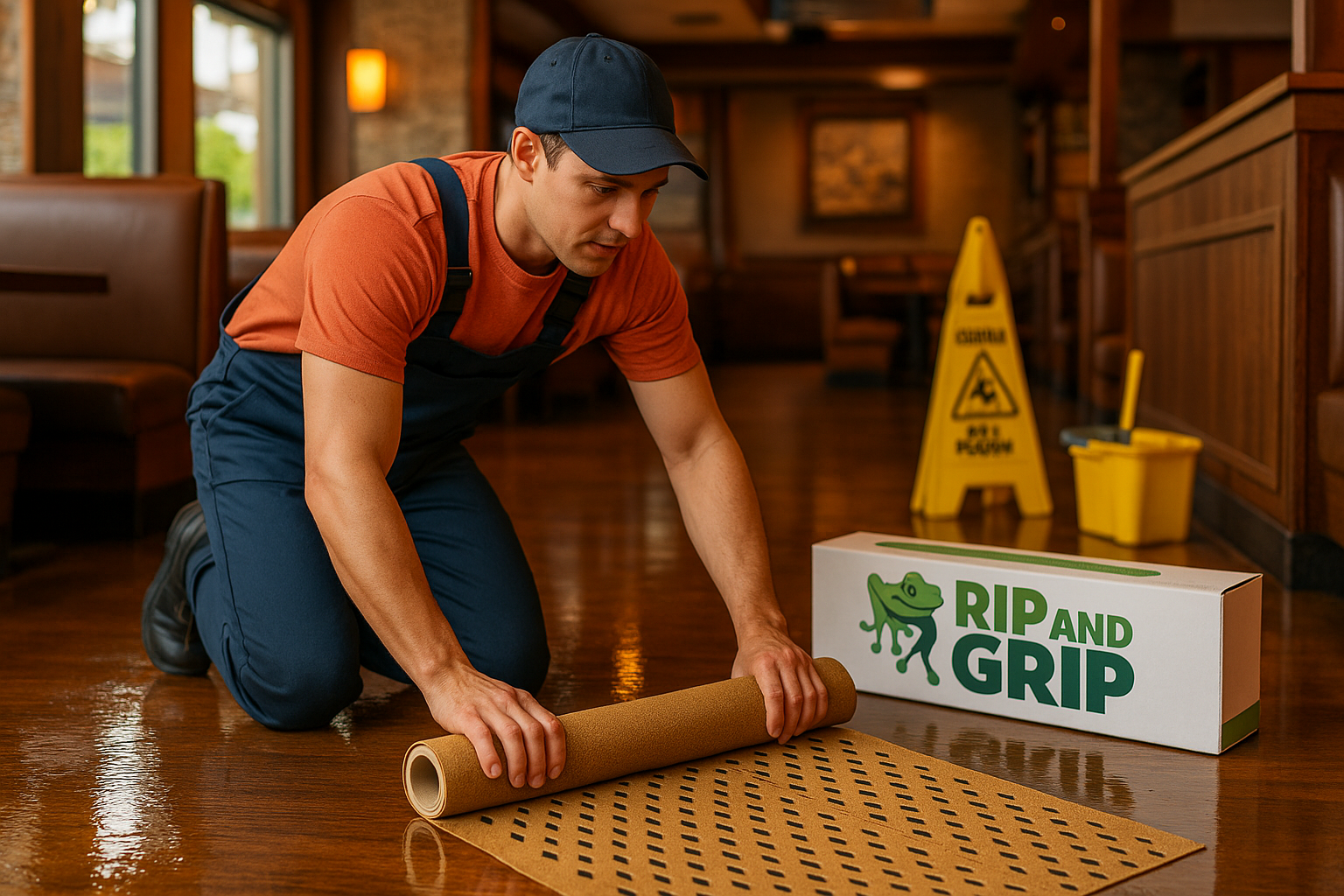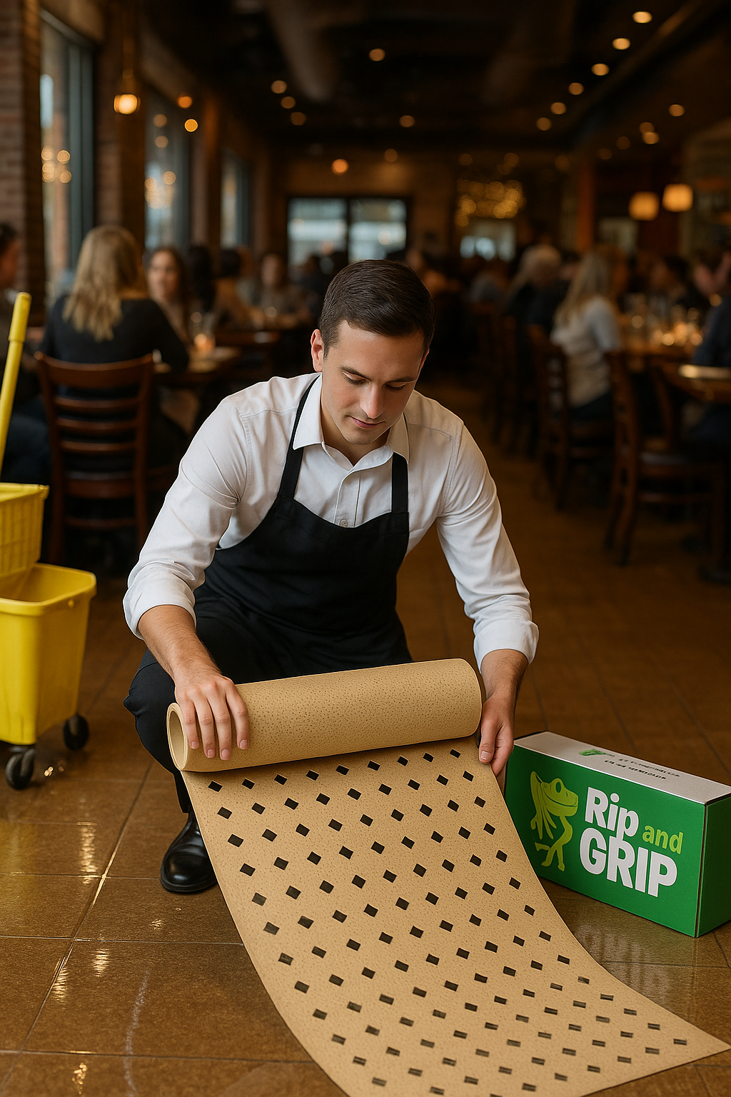 We have created a disposable, light-weight mat that stops slips and falls in their tracks. Slip and falls cost $60 billion dollars in lawsuits each year. That is why even when the floor is mopped after a spill, it is even more slippery. Our solution is a mat providing traction during your restaurants peak hours that can simply be disposed of afterwards.
